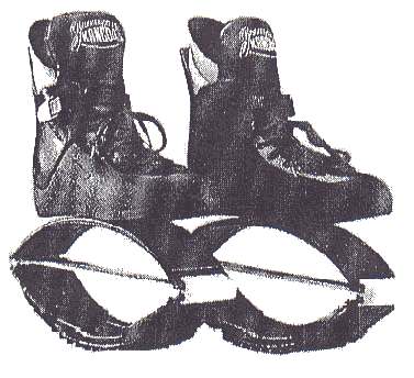 Rysunek 2. Kangoo Jumps składają się z butów podobnych do łyżworolek z wyjątkiem kółek i płóz. Pod podeszwami znajduje się eliptyczny łuk z ruchomym paskiem napiętym między zawiasami. Paski te mają zapewnić dodatkową sztywność i elastyczność odbić.