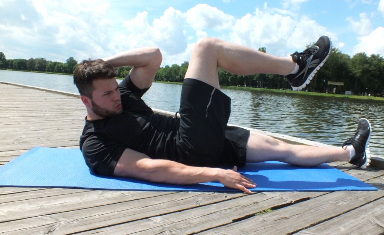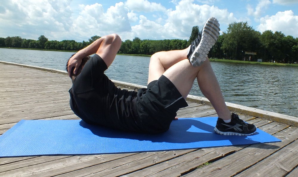 Brzuszki skośne: leżąc na plecach ugnij kolana, trzymając stopy na podłożu. Ugiete w łokciach ręce spleć nad karkiem. Podnieś prawą stopę i oprzyj ją luźno o lewe udo. Wciągając brzuch oderwij głowę, ręce i łopatki od podłoża i wykonaj skręt tułowia, próbując dosięgnąć lewym łokciem do prawego kolana (kolano również zbliż do łokcia). Wróć do pozycji wyjściowej i wykonaj ćwiczenie 12 razy, następnie zmień stronę.