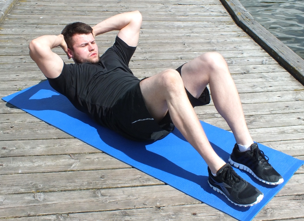 Brzuszki klasyczne: połóż się na plecach, dłonie splecione nad karkiem, nogi zgiete w kolanach, stopy oparte na podłożu. Napinając mięśnie brzucha, oderwij głowę i łopatki od podłoża. Zrób wydech. W tej pozycji broda ma być skierowana do góry. Przy unoszeniu nie zmieniaj sposobu ustawienia głowy i łokci (powinny być rozstawione na boki). Robiąc wdech, wróć do pozycji wyjściowej. Powtórz ćwiczenie 12-15 razy.