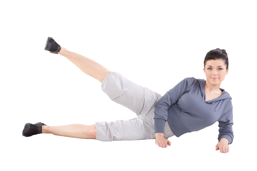 1. Połóż się na lewym boku, ciężar tułowia oparty na przedramieniu lewej ręki. Druga ręka spokojnie leży przed klatką piersiową. Dłonie ułożone równolegle do siebie. Głowa prosto, patrzymy przed siebie. Nogi jedna na drugiej.