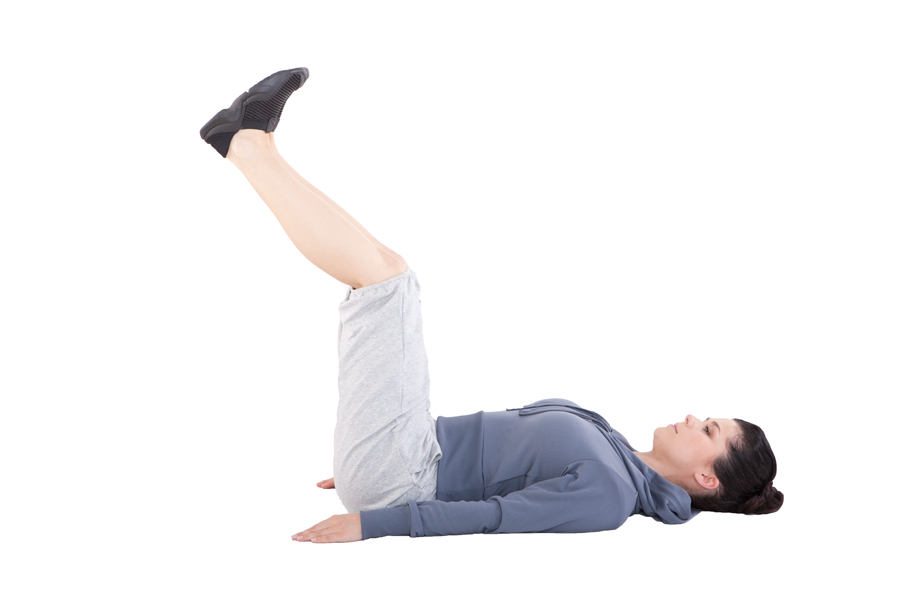 1. Leżymy na plecach, ręce spokojnie spoczywają wzdłuż tułowia. Unieś nogi pionowo, lekko ugnij kolana. Wciągnij brzuch i ściągnij łopatki.