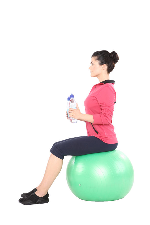 1. Weź w dłonie hantle albo półlitrowe butelki z wodą. Usiądź na piłce. Unieś ręce: łokcie na wysokości piersi, dłonie na wysokości uszu. Lekko rozstaw nogi, stopy odsuń jak najdalej od piłki. Wyprostuj się i napnij mięśnie brzucha.