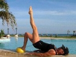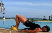 Prezentuje dwie wersje dla wytrwałych tylko z jedną stopą na piłce, drugą nogą wyprostowaną do przodu. Jeśli już i to wykonamy, można spróbować zmienić powoli nogę opartą na piłce prawie bez poruszania tułowia.
