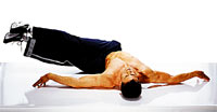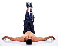 Ruch Unieś kolana płynnie w kierunku głowy zachowując nieruchomo ciało kiedy kolana będą bezpośrednio u góry. Zatrzymaj oddech kurcząc (naprężając) mięśnie brzucha. Następnie w drugą stronę opuść stopy w kierunku podłogi ale jej nie dotykaj. Utrzymuj stale napięte mięśnie twojego brzucha |