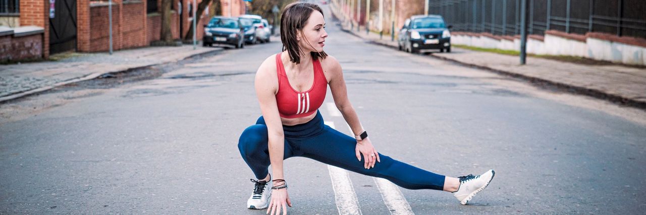 Połóż się na plecach. Unieś łopatki, głowę podtrzymuj rękoma, ale nie ciągnij jej. Broda jest oddalona od mostka naturalnie. Przyciągnij nogi do klatki, połącz pięty, a palce skieruj na zewnątrz. Pchnij nogi pod kątem 45 stopni, tak aby odcinek lędźwiowy kręgosłupa został przyklejony do maty. Powtórz 10 razy.