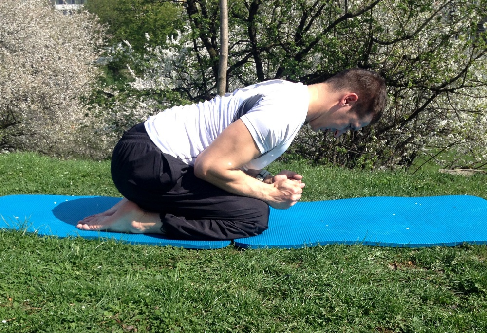 Symbol do koncentracji trójkąt. W klęku opuszczamy tułów, kuląc się, jednocześnie dłonie zaciskamy w pięści. Oddychamy 14 krotnie koncentrując się na trójkącie.