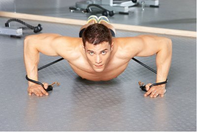 Ćwiczenie na mięśnie klatki piersiowej - pompki z bodylastics. Ćwiczenie wygląda jak zwykła pompka, ale dla zwiększenia oporu, przeciagnij linę bodylastics za swoje plecy, trzymając ją w obu dłoniach, które spoczywają na ziemi.