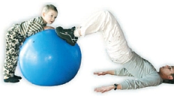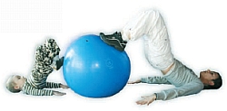 Dziecko opiera się swobodnie na piłce, aby ją zablokować w jednym miejscu. Mama opiera się na niej całymi stopami. Dłonie wzdłuż ciała. Mama unosi i opuszcza biodra w czasie ćwiczenia nie opuszczajàc ich na podłogę. |