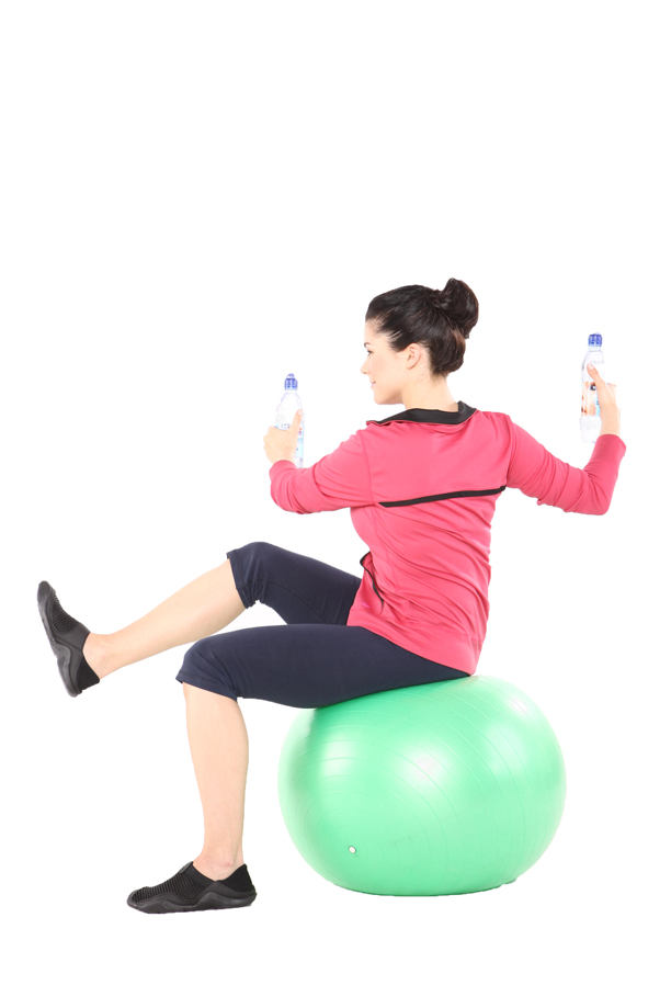 1. Weź w dłonie hantle albo półlitrowe butelki z wodą. Usiądź na piłce. Unieś ręce: łokcie na wysokości piersi, dłonie na wysokości uszu. Lekko rozstaw nogi, stopy odsuń jak najdalej od piłki. Wyprostuj się i napnij mięśnie brzucha.