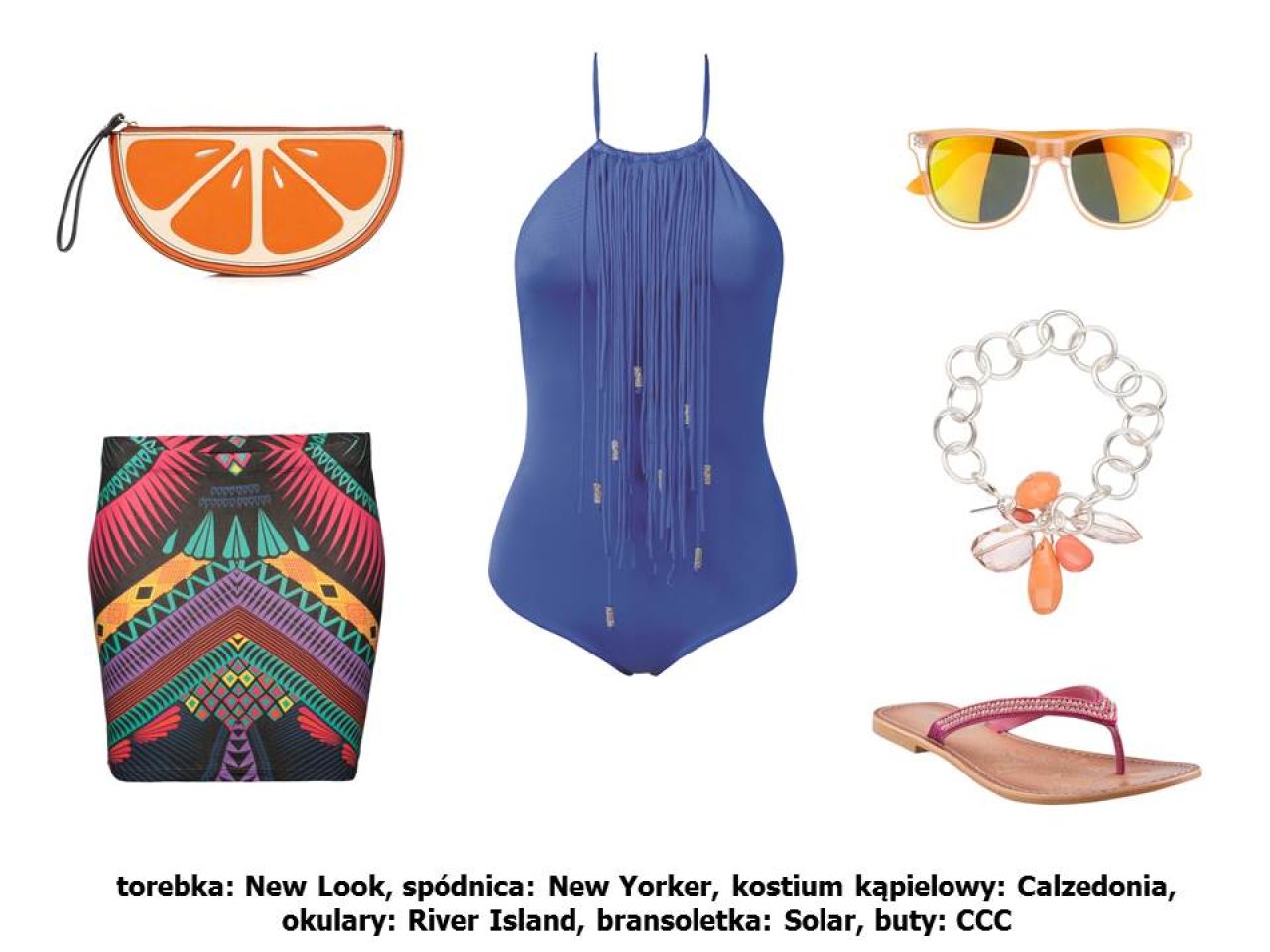 Letnie trendy zachęcają do zabawy barwami i printami. Szukasz niezobowiązującego zestawu w tropikalnym stylu? Jednoczęściowy kostium w mocnym kolorze połącz ze spódniczką w aztecki wzór. Odważne nadruki najlepiej sprawdzają się w towarzystwie wyrazistych odcieni różu i cytrusów. Egzotyczny charakter stylizacji podkreślą najmodniejsze akcenty – frędzle i owocowe motywy.