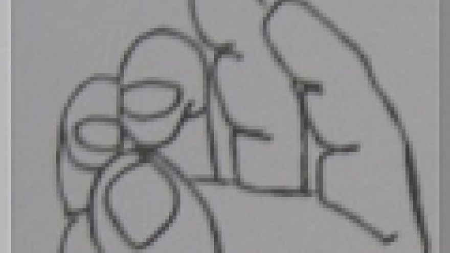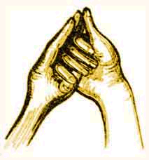 Cztery palce prawej ręki obejmują kciuk lewej ręki. Kciuk ręki prawej dotyka opuszki środkowego palca ręki lewej. Pozostałe palce ręki lewej dotykają zewnętrzną stronę prawej dłoni.