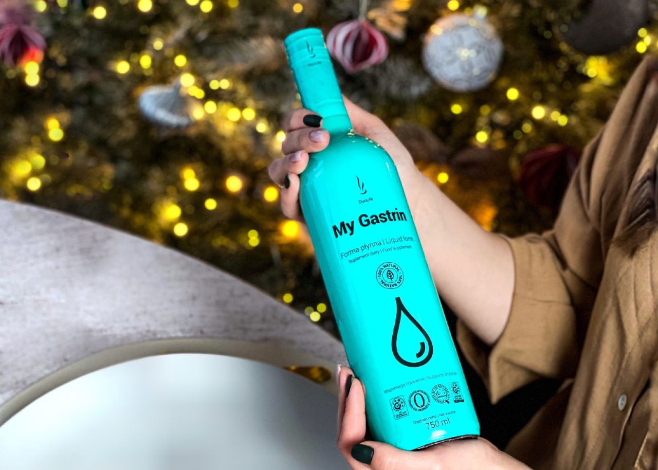DuoLife My Gastrin to preparat w formie płynnej oparty na naturalnych składnikach. Zawarte w nim ekstrakty roślinne pochodzące m.in. z kopru włoskiego, szałwii libańskiej, mięty pieprzowej czy czarnej rzodkwi sprzyjają łagodzeniu objawów związanych ze wzdęciami, łagodzą dolegliwości żołądkowo-jelitowe, zapobiegają zaparciom i sprzyjają ochronie żołądka. DuoLife My Gastrin rekomendowany jest także jako wsparcie dla osób narzekających na kłopoty trawienne po spożyciu tłustych posiłków.
